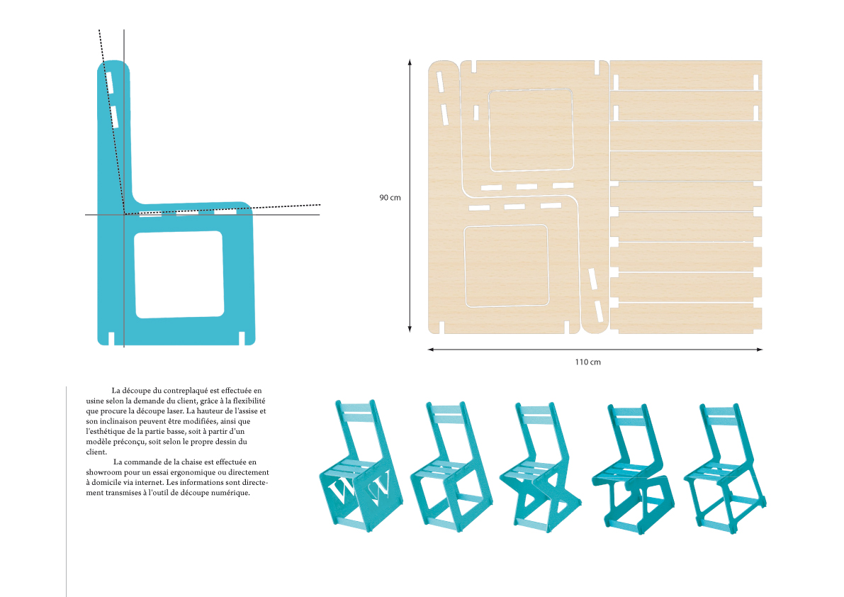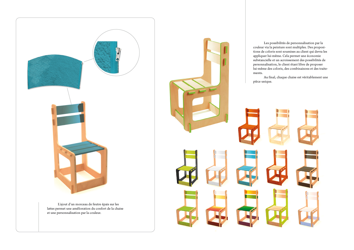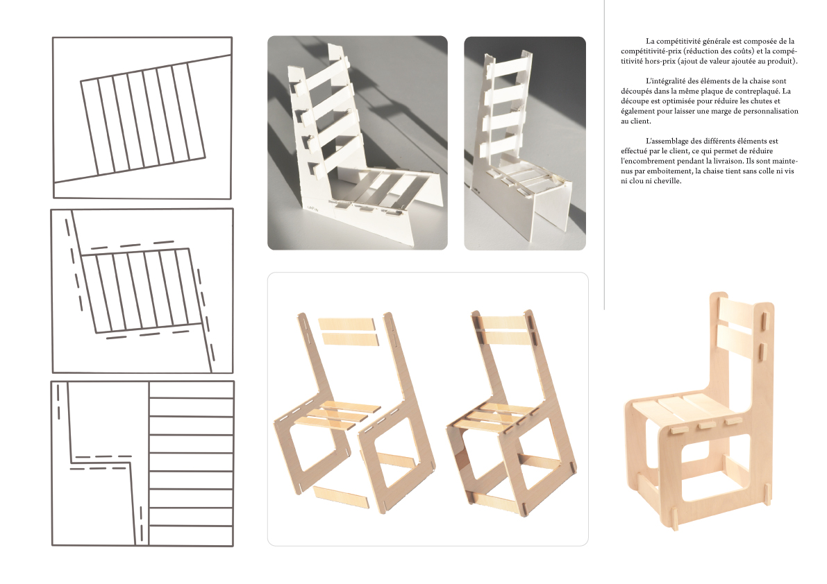 Ce mobilier a été conçu pour permettre une réduction des coûts liés à sa production, sa livraison, son assemblage, tout en permettant à l'usager d'avoir une marge de personnalisation.