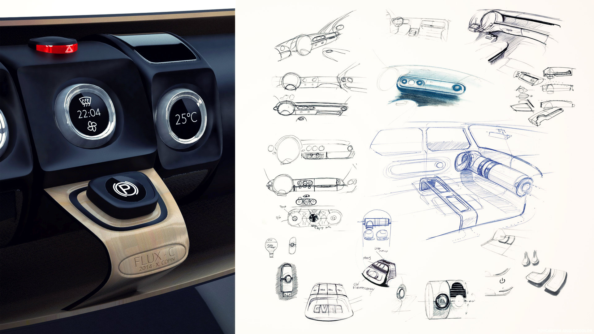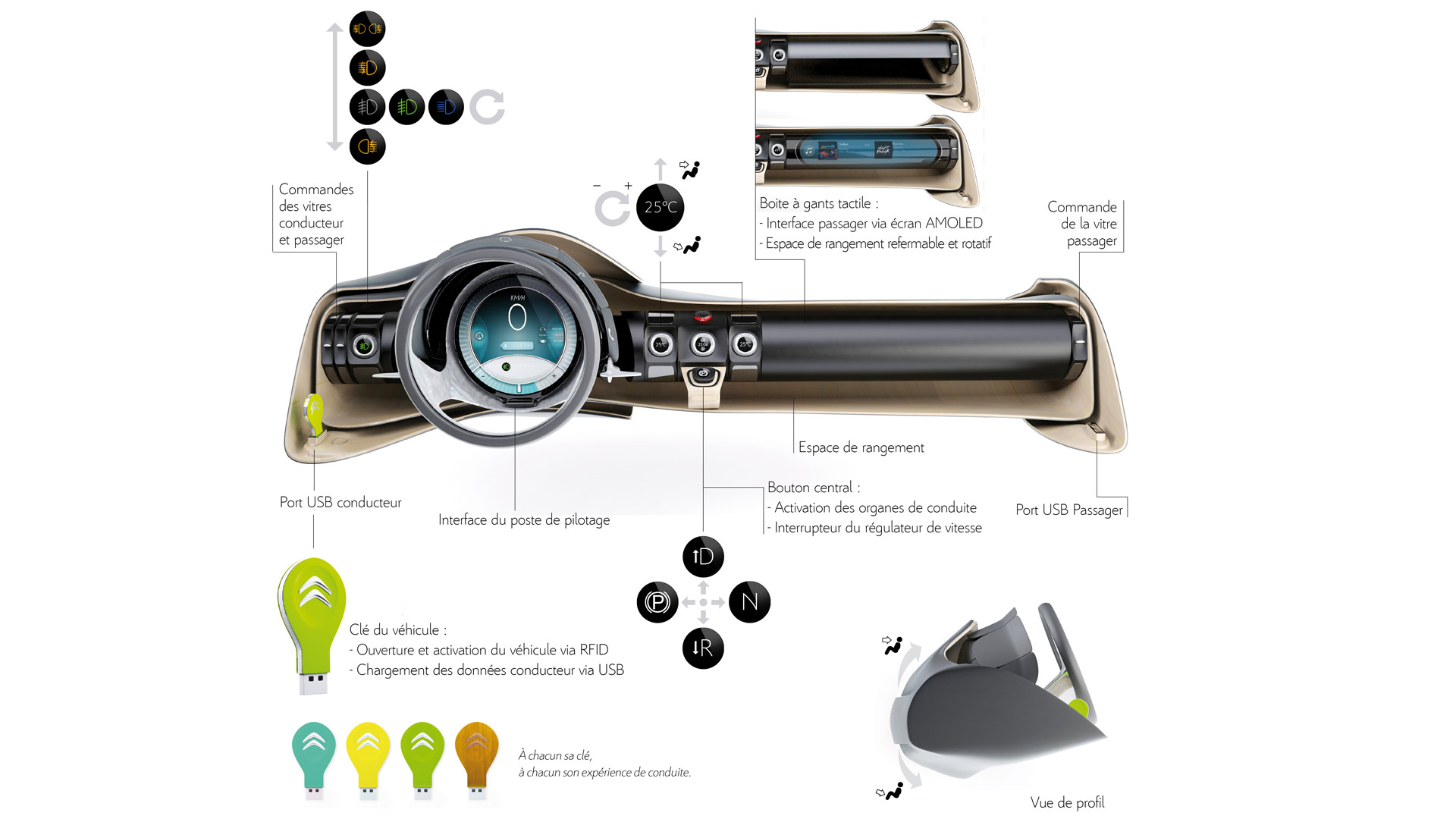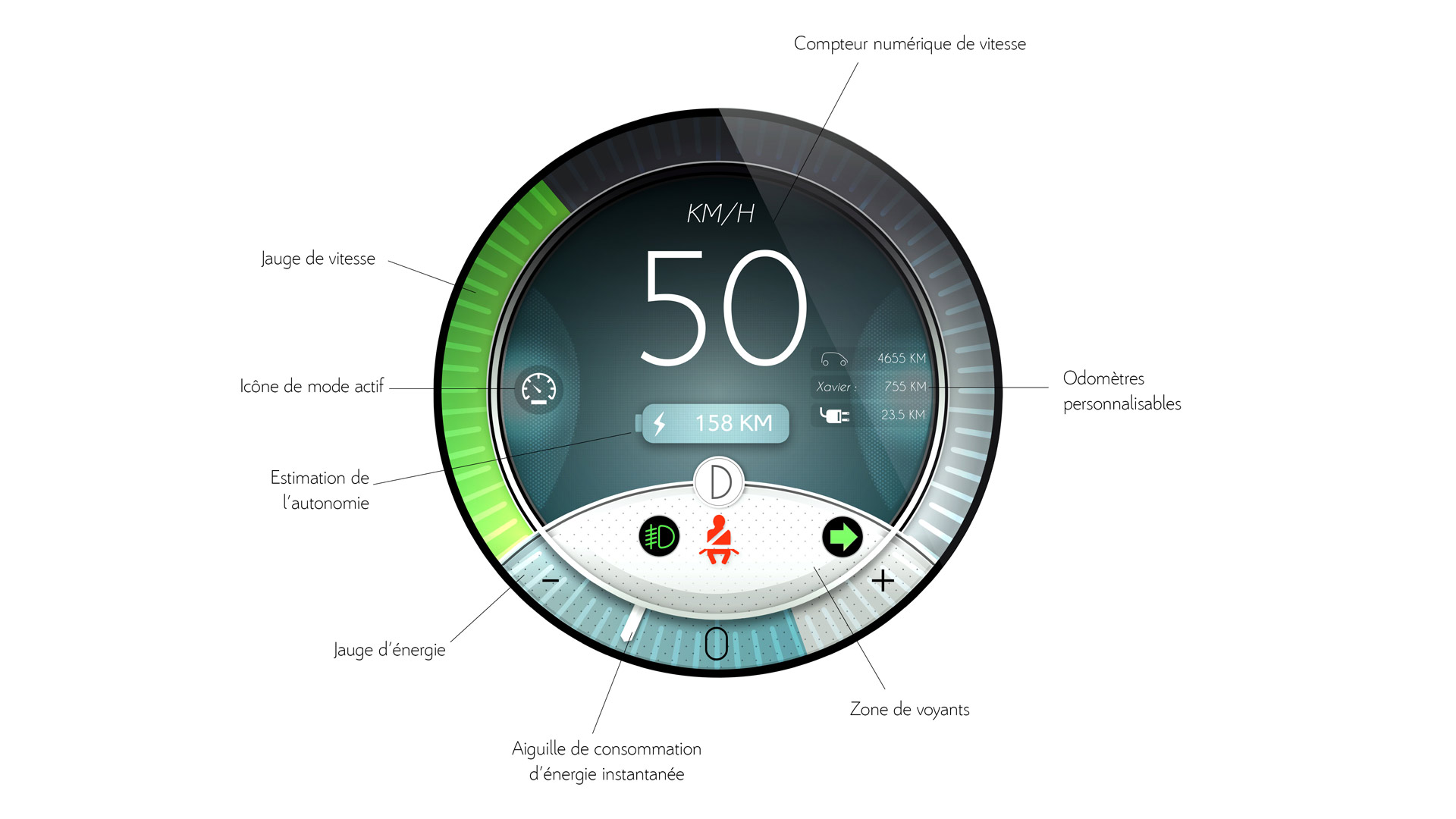 L'idée de ce projet est de penser la globalité des échanges de l'ensemble conducteur/interface/automobile/environnement de manière intelligente et logique. Il s'agit de questionner la présence et la nature des organes composant l'interface automobile, et la manière dont ils sont organisés autour de l'usager et intégrés au véhicule. Une répartition des flux d'informations pensée de manière globale permet d'éviter les incohérences et apporte confort et sécurité lors de la conduite.