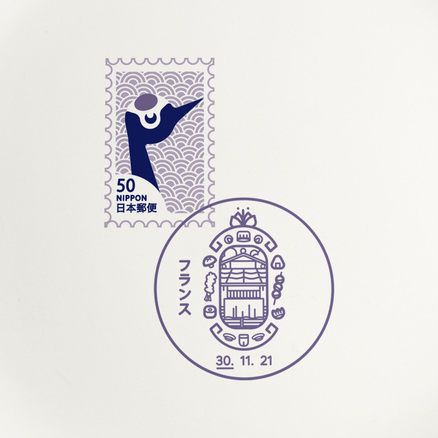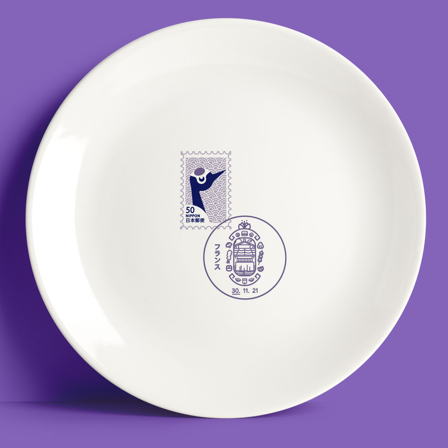 L’assiette est une partie intégrante du rituel culinaire. Un support de présentation, de dégustation qui au fil des années traverse le temps et préserve des souvenirs. À travers cette assiette, j’ai souhaité créer un dialogue avec le dégustateur. Face à l’assiette, il découvre l’esthétique du plat, puis sa composition grâce à ses sens gustatifs. À la fin du rituel, l’assiette semble vide, elle met fin au voyage sensoriel avec, comme seule trace, le timbre et le cachet de courrier postal. La grue japonaise, présente sur le timbre, présage bonne fortune et longévité pour tout dégustateur.